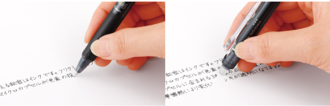 这款双色摩擦笔有一个变色笔头和一个书写笔头,用书写笔头写下后一开始是较深的颜色,用变色笔头涂抹后颜色改变。