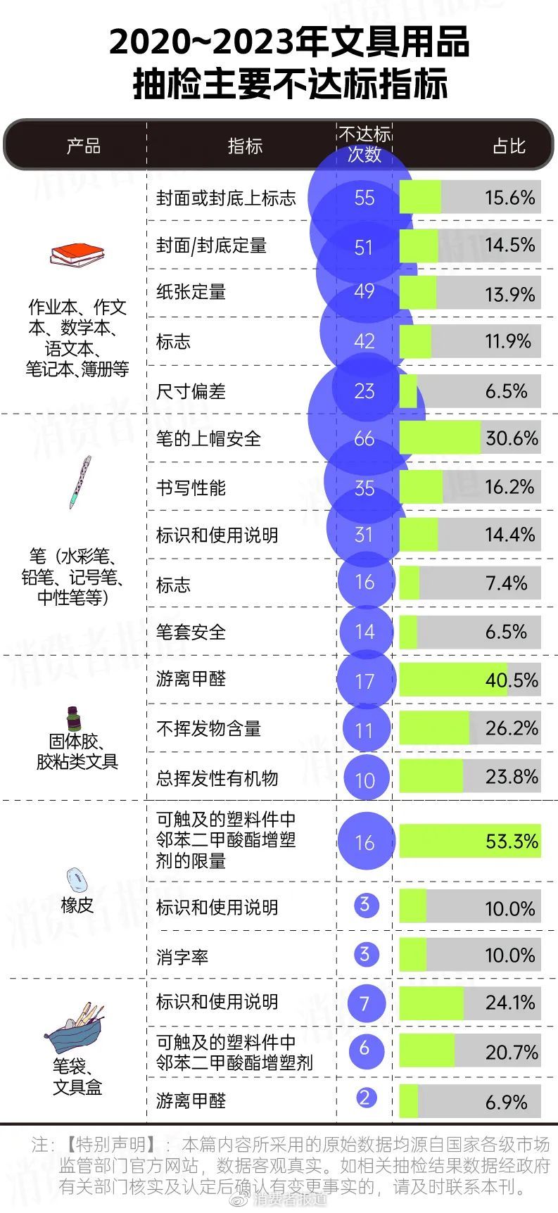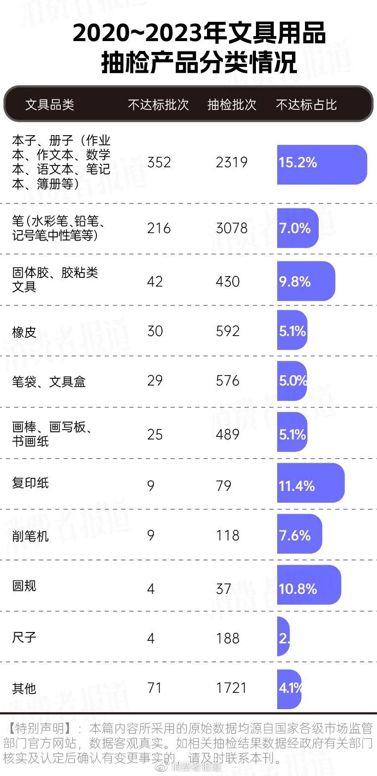 2023年2月,《消费者报道》整理了国家、省市级市场监督管理局于2020年至2023年这3年发布的关于文具用品的抽检数据。
