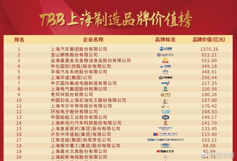 上海制造业品牌价值榜第2名是宝山钢铁,品牌价值922.21亿元。是全球领先的现代化钢铁联合企业,宝武钢铁集团有限公司的核心企业,粗钢产量、汽车板产量、硅钢产量均排在全球前列;上海制造业品牌价值榜第1名是上海汽车集团,品牌价值1370.26亿元。主要业务包括整车(含乘用车、商用车)的研发、生产和销售,去年上汽集团销售整车530.3万辆,连续十七年保持国内第一,自主品牌、合资品牌新能源车销量均实现高速增长。