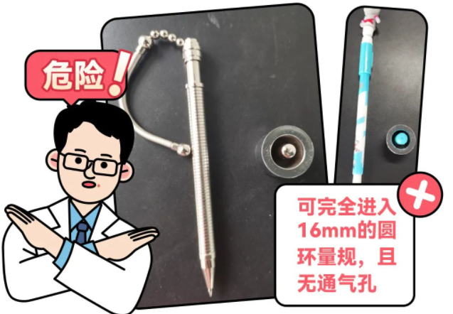 15批次样品的笔套既可完全进入16mm的圆环量规(意味着不够大),又无通气孔(意味着空气流量不足),不符合标准要求。(GB 21027—2020《学生用品的安全通用要求》)