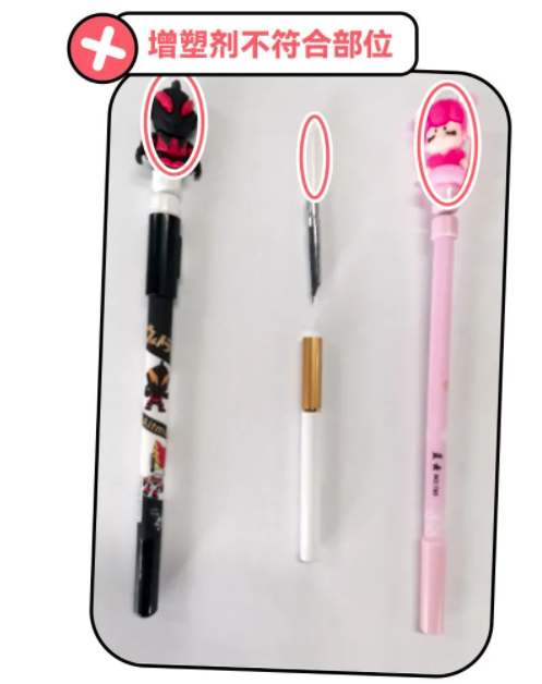 - 3批次样品的可触及的塑料部件中增塑剂含量实测值为3650mg/kg—200000 mg/kg,不符合标准中总含量应不超过1000mg/kg的规定。(GB 21027—2020《学生用品的安全通用要求》)