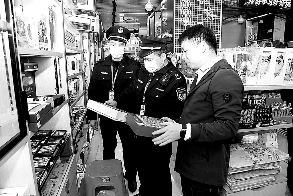 图为该局执法人员正在一家文具店检查文具用品质量安全。鲁丽军 廖胜华 文/摄