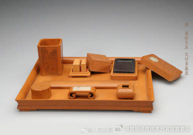 开学在即,你的文具准备好了吗?这套文竹多盛盘,内盛竹雕笔筒、印泥盒、印章、水丞、墨床、石砚盒、臂搁七件文具,分别雕刻山水、夔纹、回纹等装饰。#是真要开学了#,愿广大学子,文思澎湃如泉涌,才学猛进如破竹!(故宫博物院)