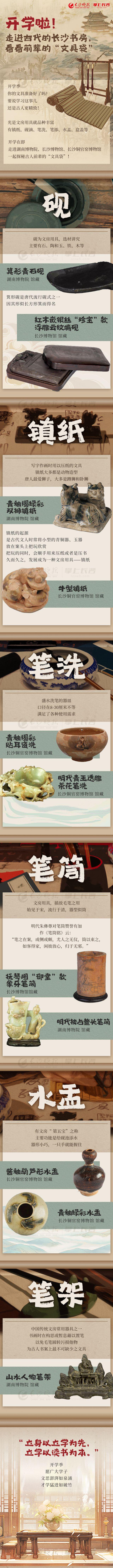 开学季,你的文具准备好了吗?要说学习这事儿,还是古人更精致!光是文房用具就品种丰富,有镇纸、砚滴、笔洗、笔掭、水盂、盒盖……开学在即,走进湖南博物院、长沙博物馆、长沙铜官窑博物馆,一起探秘古人前辈的“文具袋”!
