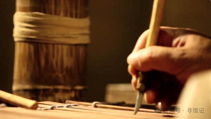 ③烘竹(杀青):用工具刮去竹子表面的青色竹皮,用火烘干水分,以防腐朽,方便保存和书写。