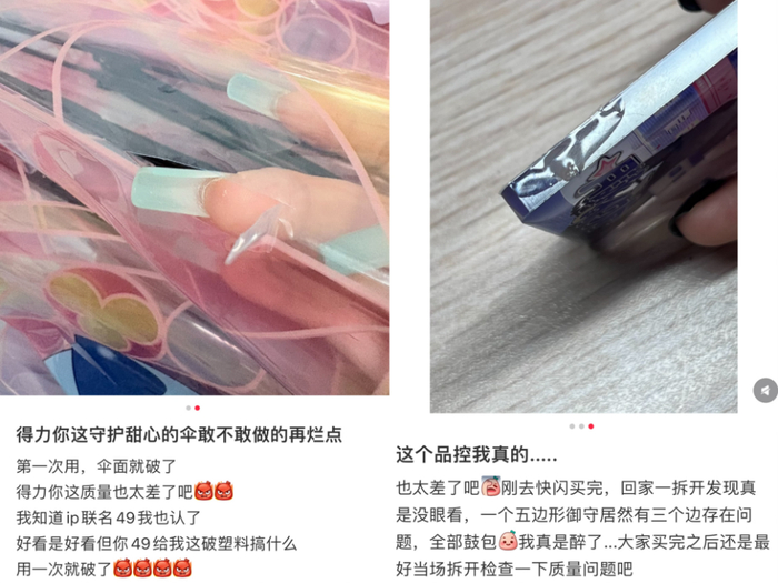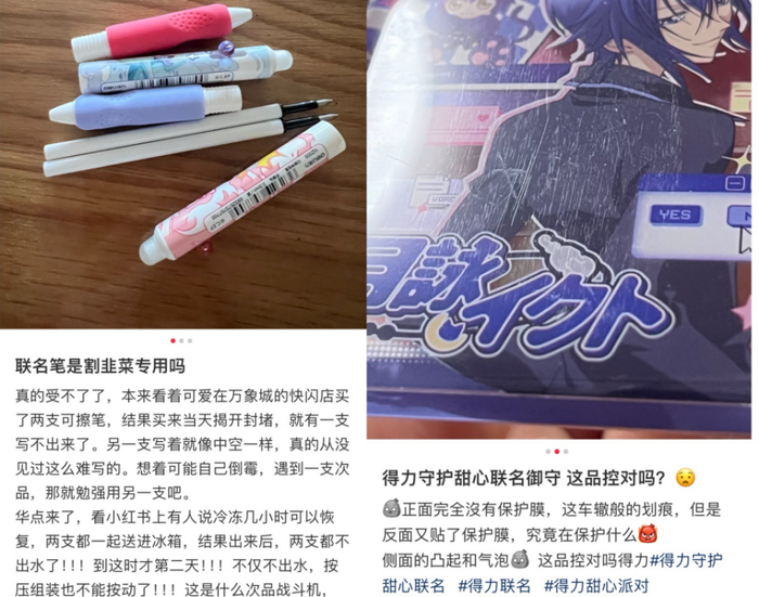 不止一位网友在社媒平台上表示联名周边出现破损、鼓包、划痕等情况,有网友直言“联名笔是割韭菜专用吗?”