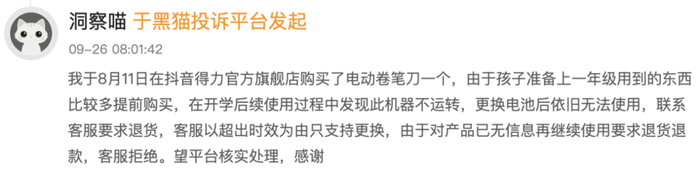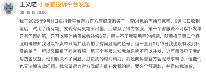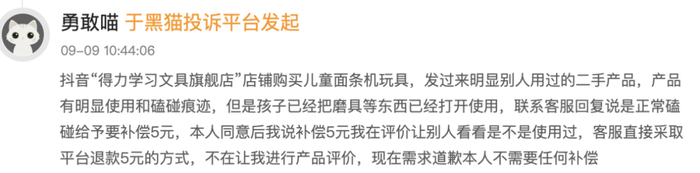 今年9月,有顾客投诉称,在得力官方店铺买的电动卷笔刀不运转,无法使用;线上购买的儿童面条机玩具明显是使用过的二手产品,产品有明显使用和磕碰痕迹;还有消费者买到的84色丙烯马克笔,有两支不出墨,但其补发需求一直得不到解决。目前,上述投诉均在“处理中”状态。