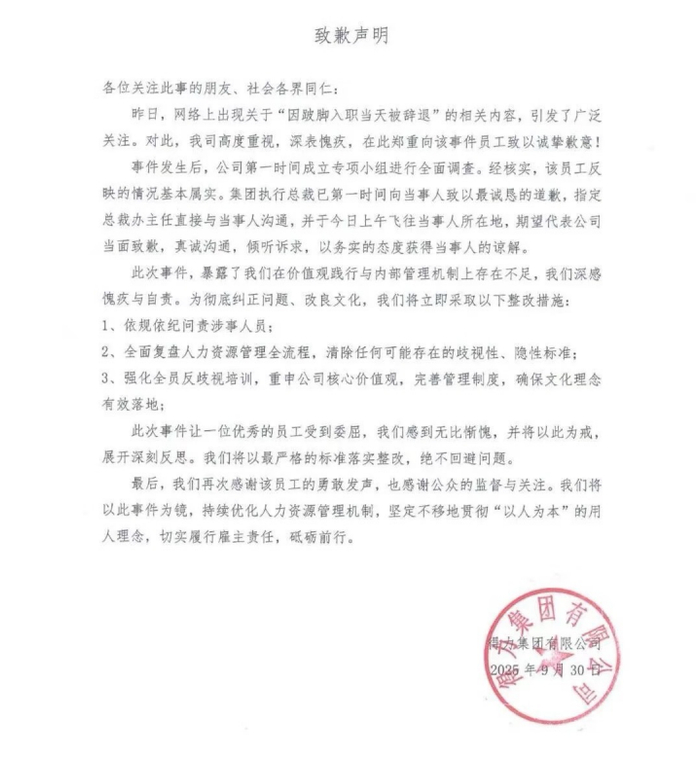 9月底,“得力辞退跛脚员工”的话题迅速冲上热搜,得力集团第一时间给出正面回应。