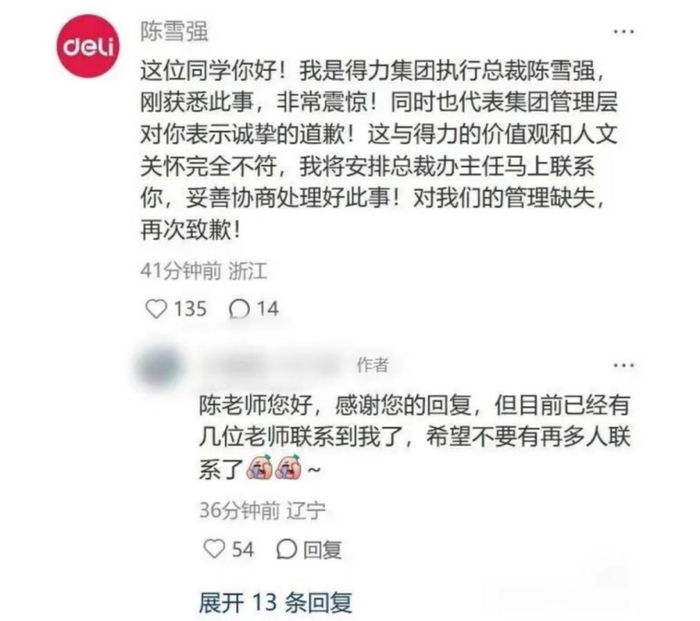 公司执行总裁陈雪强连夜致歉,在该帖评论区留言称:“刚获悉此事,非常震惊!代表集团管理层对你表示诚挚的道歉!这与得力的价值观和人文关怀完全不符,我将安排总裁办主任马上联系你,妥善协商处理好此事!对我们的管理缺失再次致歉!”