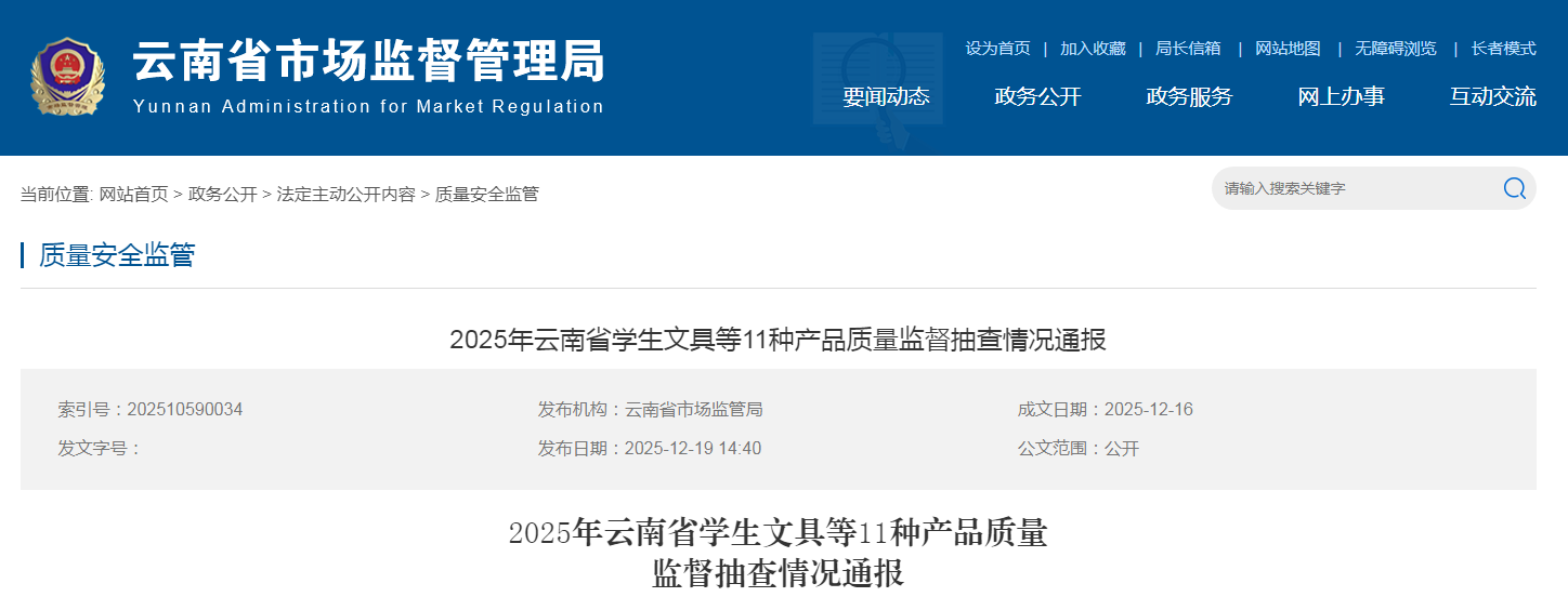 中国质量新闻网讯 据云南省市场监管局网站消息,2025年,云南省市场监督管理局按照年度工作计划,在全省范围内开展了学生文具、纸尿裤、儿童鞋、卫生巾、塑料购物袋、生活用纸(第2批)、非医用口罩、儿童和婴幼儿服装、老视成镜、老人鞋、衬衫等产品质量监督抽查,现将主要情况通报如下: